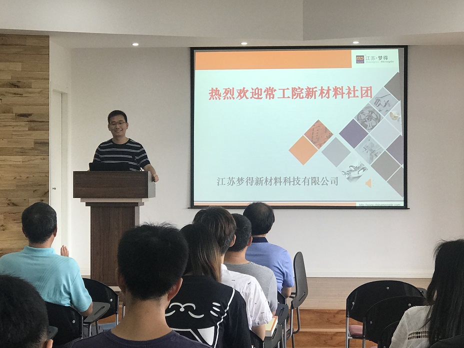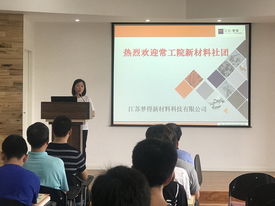 2018年6月24日,常州工學院與江蘇夢得新材料科技有限公司共同舉辦瞭(le)第一屆新材料社團活動並(bìng)取得圓滿成功。新材料社團是由常工院數理與化工學院與江蘇夢得一起組建的,並(bìng)受學院團委領導(dǎo)管理和院系指導的學生社團組織。社團旨在培養學生在新材料的設計、制備(bèi)和應用等方面的能力。将産(chǎn)、學、研相結(jié)合,在人才培養、文化交流、專業建設等方面,實現瞭(le)互相支持、互相滲透、雙向結(jié)合、優勢互補(bǔ)、資(zī)源互用、互利共赢。