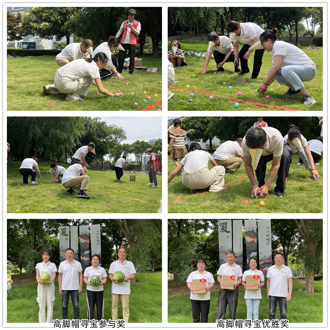 高腳帽尋寶:3人一組,分兩排站立,帶上帽子遮住眼睛,從帽子縫隙尋球,共同尋找寶(bǎo)球並(bìng)送至本隊球桶中,入桶中球多者獲勝。