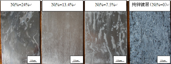 由表4-1可見,含鎳量爲13.4%的Zn-Ni合金鍍層(céng)耐蝕性能優於(yú)其它含鎳量的Zn-Ni合金鍍層(céng);含鎳量24%的Zn-Ni合金鍍層(céng)耐蝕性稍優於(yú)含鎳量7.5%的Zn-Ni合金鍍層(céng);而堿性純鋅鍍層(céng)(含鎳量爲0)的耐蝕性較差。